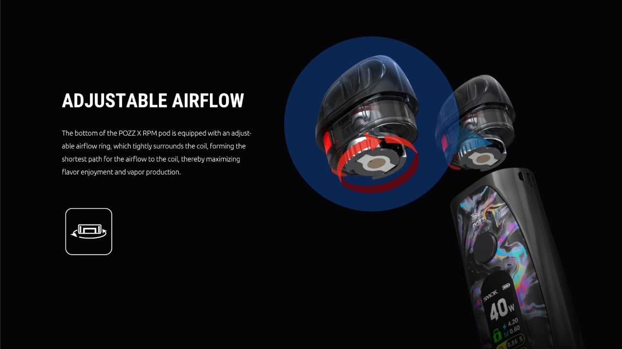 تبي جهاز خفيف في اليد وثقيل في الأداء؟ جهاز POZZ X من شركة SMOK يعطيك سحبة رايقة تنفع للسيجارة أو الشيشة، والفضل كله لنظام الهواء القابل للتعديل اللي يخليك تتحكم بكل نفس حسب مزاجك.