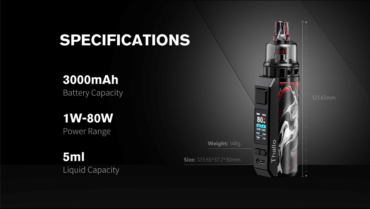 إذا كنت تدور على جهاز يجمع بين القوة والأناقة، فـ SMOK Thallo هو خيارك المثالي! بطارية داخلية 3000 مللي أمبير تكفيك يوم كامل وأكثر، وقوة توصل لـ 80 واط تعطيك تحكم كامل بسحبتك سواء كانت شيشة أو سحبة سيجارة.