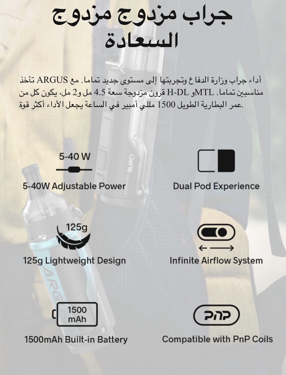 Voopoo Argus 40W Pod Kit هو الحل الذكي لعشاق السحبة والسيجارة الإلكترونية والشيشة، بتصميم متين خفيف يناسب كل يد وكل مزاج.