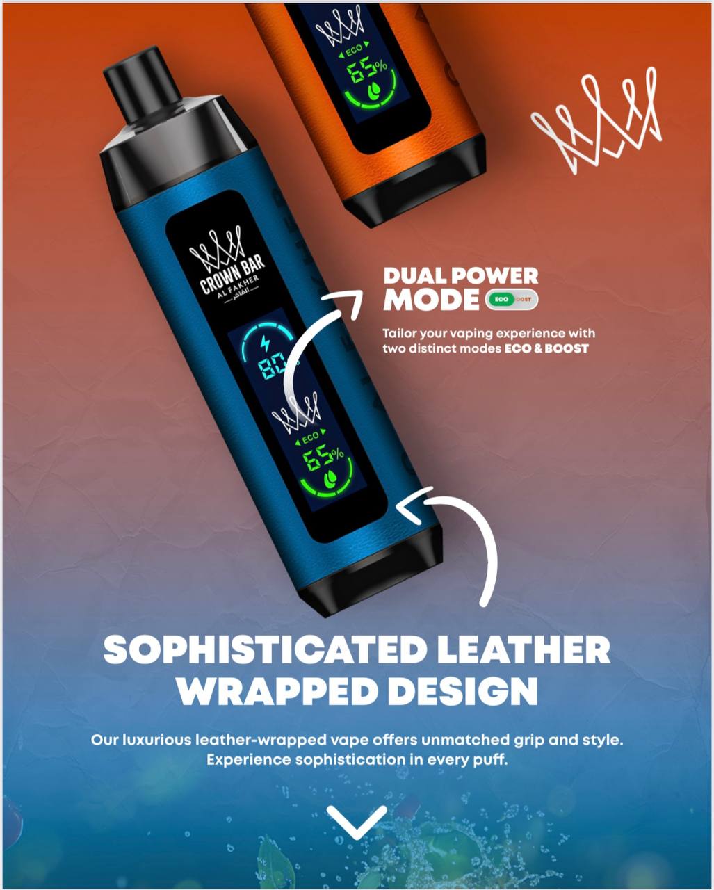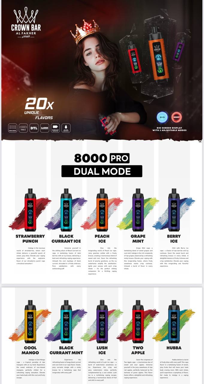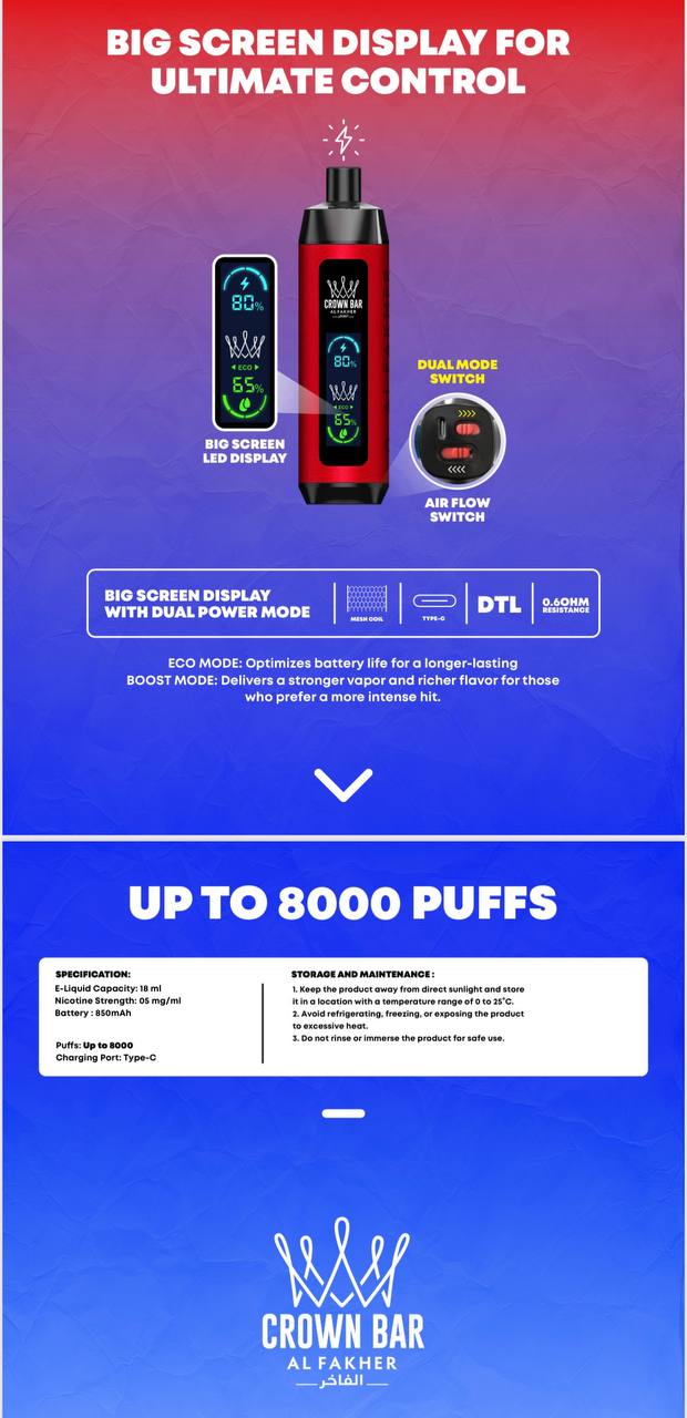 لو كنت تدور على فيب يغيّرك المزاج ويشبه إحساس الشيشة، جهاز كراون بار برو 8000 Crown Bar PRO من الفاخر هو الخيار الأمثل لك.